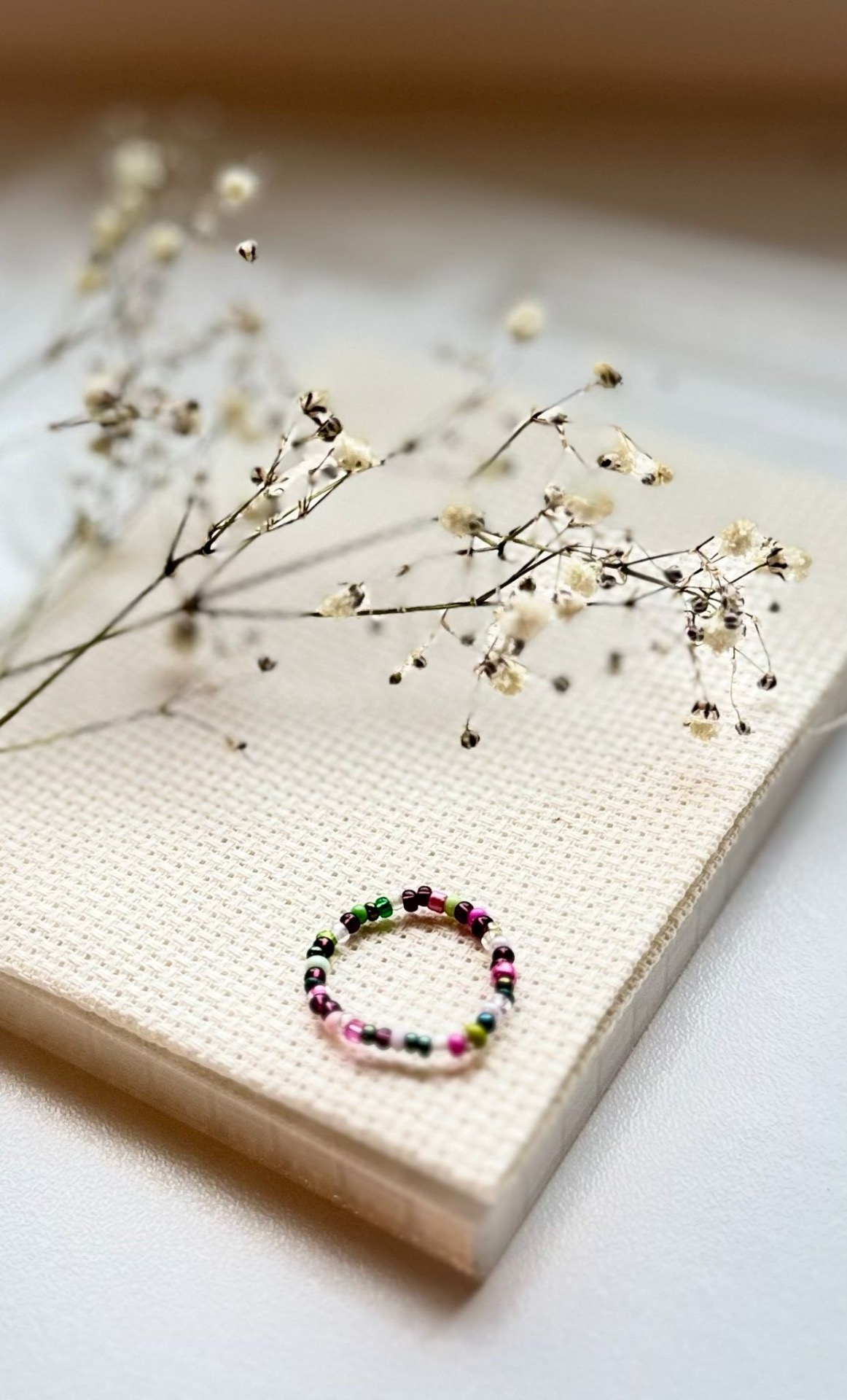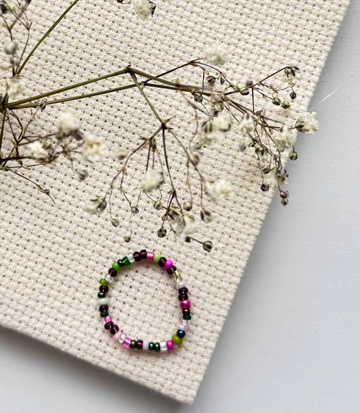 Objevte Barevnou symfonii – jedinečný ručně vyrobený prstýnek, který okouzlí svou barevnou rozmanitostí a jemným designem. Tento prstýnek je tvořen korálky různých barev, včetně zelené, růžové, fialové a černé, které jsou pečlivě navlečeny a uspořádány do krásného kruhu. Korálky vytvářejí harmonický a vyvážený vzhled, který dodává prstýnku hravý, ale zároveň elegantní nádech.